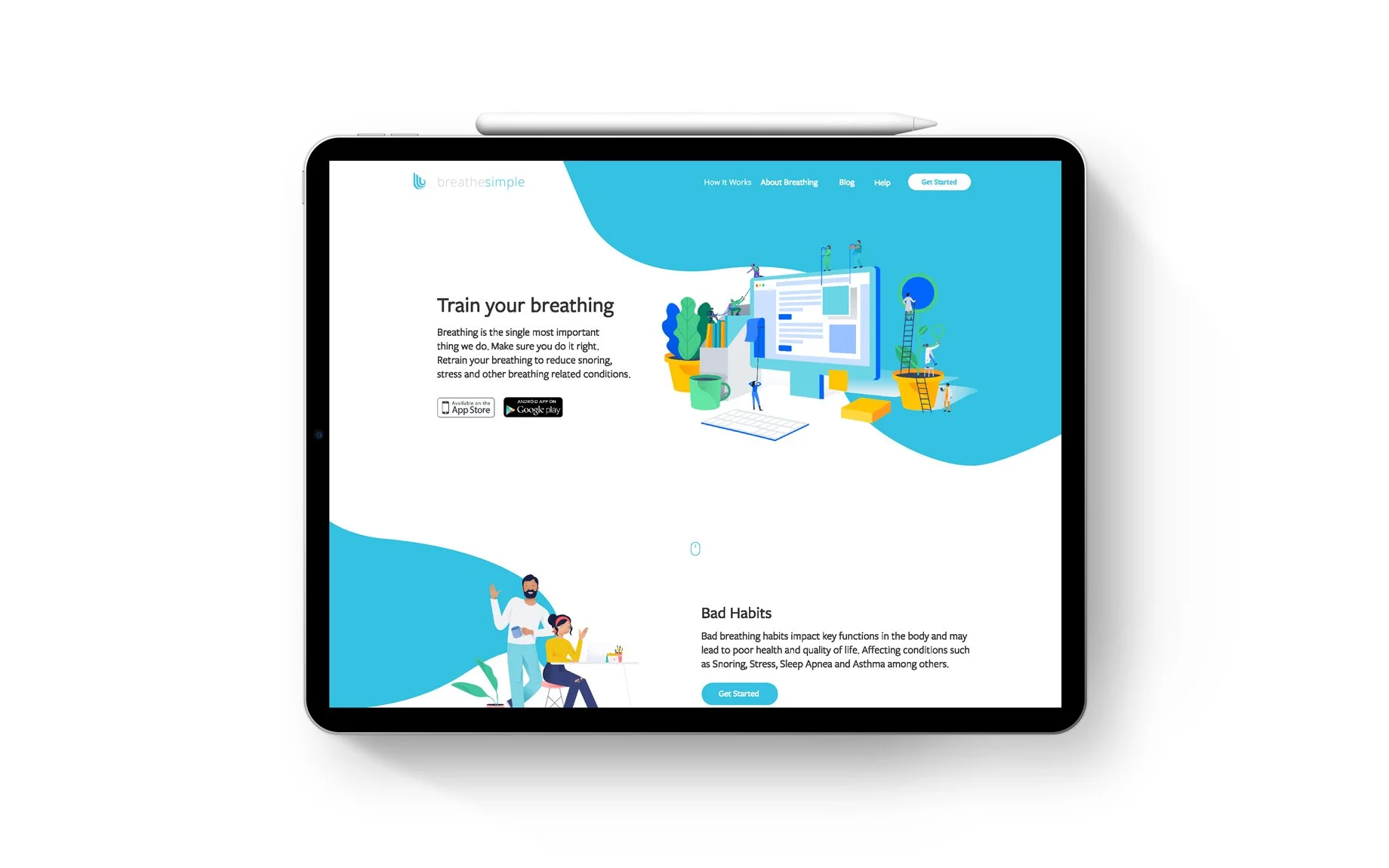 UX/UI Digital Designer | June 2018 - July 2019My first role at The Big Group was to lead the team in creating the UI UX for breathesimple. A company helping people with health issues such as snoring, sleep apnea and stress. Breathing might be straightforward but many of us surprisingly don't breathe how we should and this affects our sleep with can cause health issues. The aim is to help users test their breathing which would then create a personal course to improve the breathing over time.