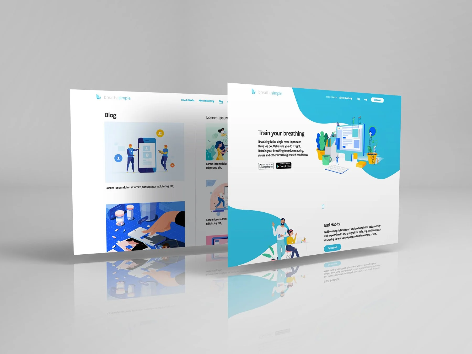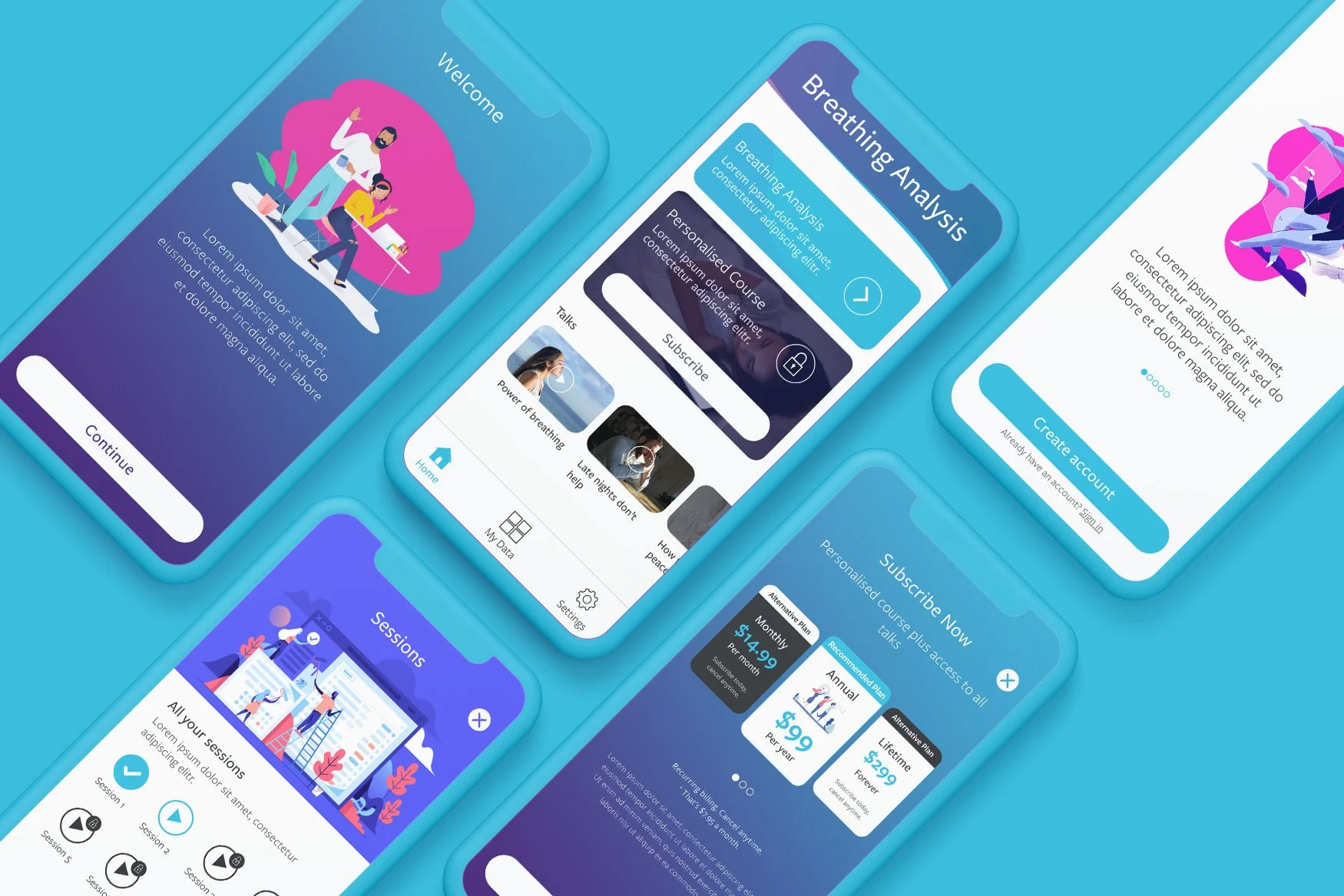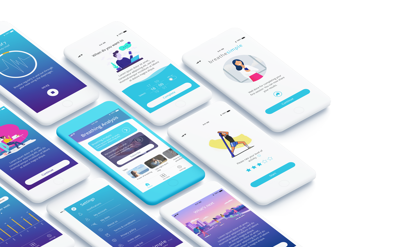 I wanted to keep it simple, clean and fun but still have a look which meant we're professional after all we're advising users on their health so when used people would have to feel confident when using the app which will be the main focus of the project as it is the app which would provide the training for users breathing. After some research, I knew that the colour blue was a common style in the medical field and colour users would feel comfortable with. The font was clean and had a rounded style to it and to complete the overall look a beautiful but strong gradient completed the foundation of the design.