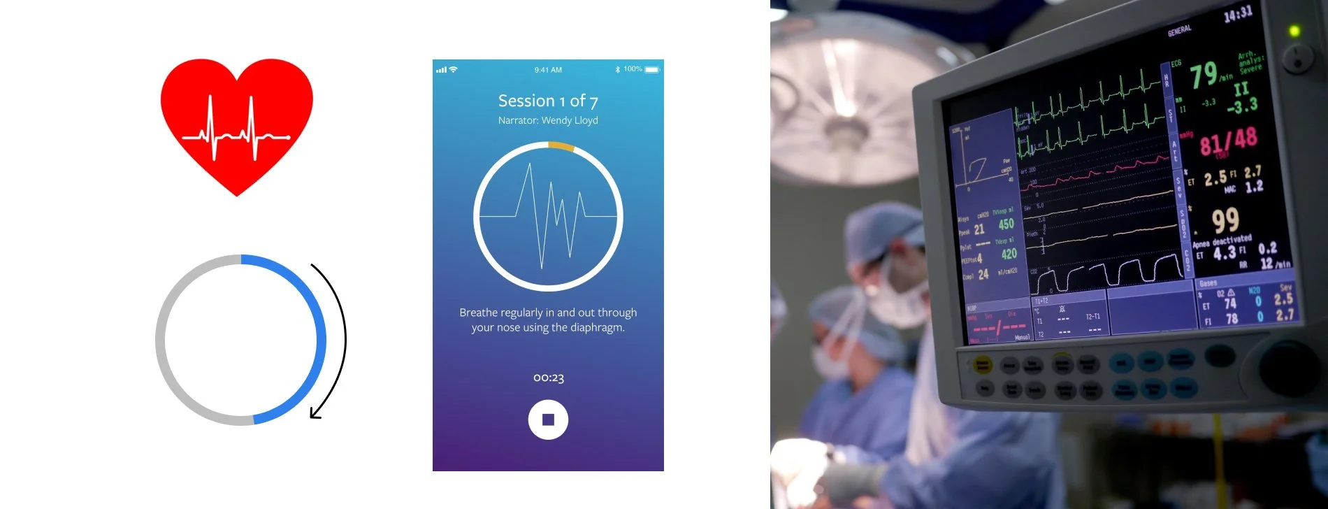 I studied the heart and its wave pattern. How a medical wave reads on a screen in a hospital when being examined by a doctor. The indicator also had to show a visible timer and countdown. The user needed to be able to stop and play at any time even though this could interrupt their breathing. Indication of sessions and how far along they are. All this was taken into consideration when creating the main screen.