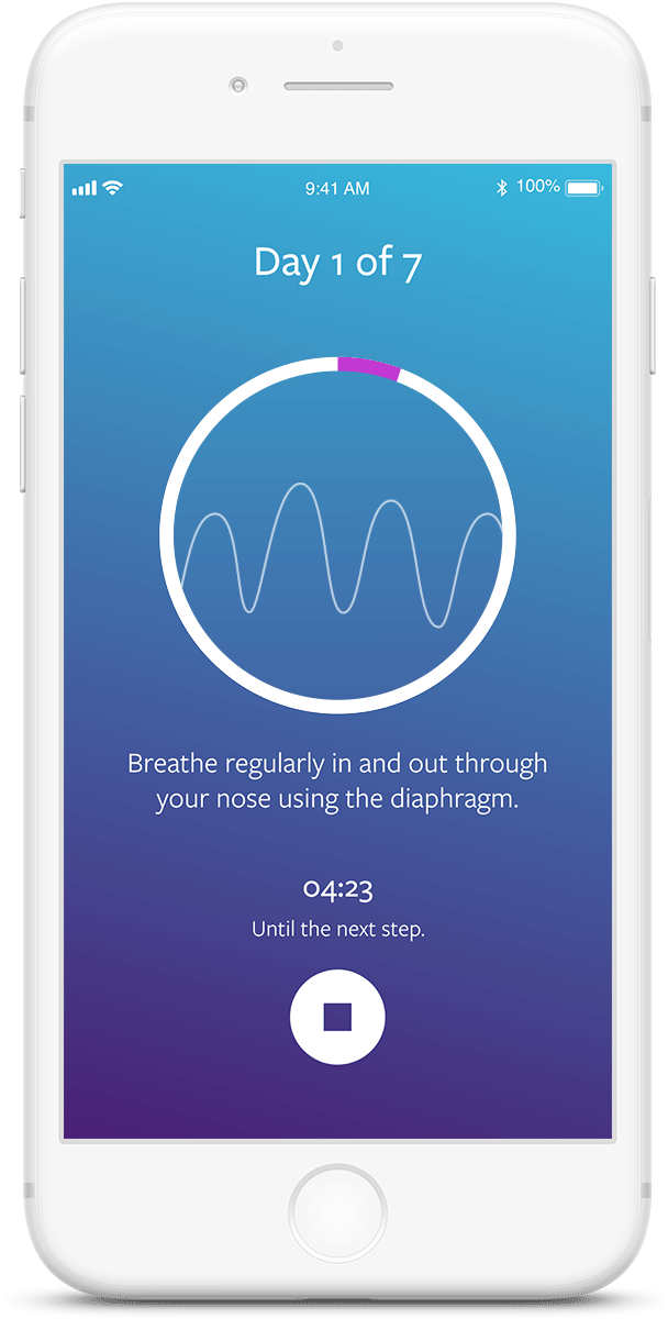 So firstly the patient needs to give us their pattern of breathing for a number of days before we can recommend them a plan. I need to design a screen to tell users that they had to breathe normally for a few minutes so their breathing patterns can be recorded. The user will need to do this in a quiet place and to be sitting upright. The audio narrator that will be speaking to the user is Wendy Lloyd, an English voice-over artist and radio and TV presenter. I researched other apps that helped users to be calm and meditate, it was a great insight of how to tell a story with a clear and calm voice. I felt apps such as Headspace, Calm & Fabulous did it best when showing a timer, countdown and audio calming the user as they gave instructions.