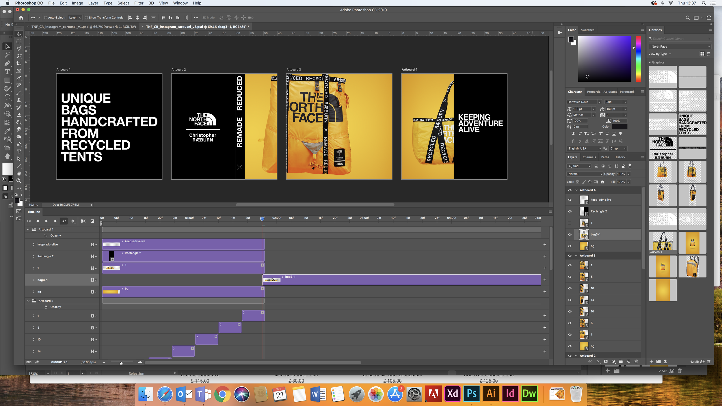 One of my favourite brands being an outdoor person was The North Face and I had this opportunity to work on their new merchandise which involved a British designer keen on using recycled tents and creating new products with them such as the bag you see below. The idea behind this task was to keep the design clean and minimalistic to keep the colour palette to a minimum achieved this and with added animation really made this a fine project to work on.